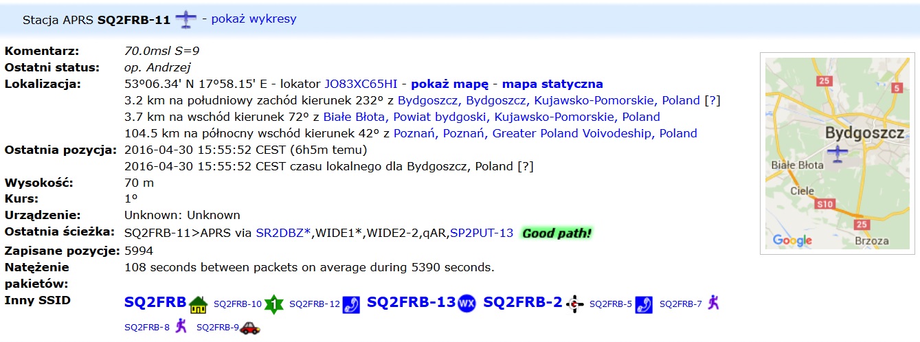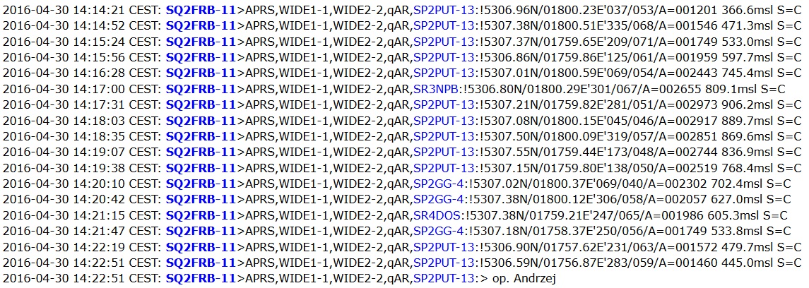 Nasz wybitny Klubowicz – Kolega Andrzej SQ2FRB wykorzystuje sprzyjającą wiosenną pogodę do aktywności w sieci APRS podczas podniebnych lotów…