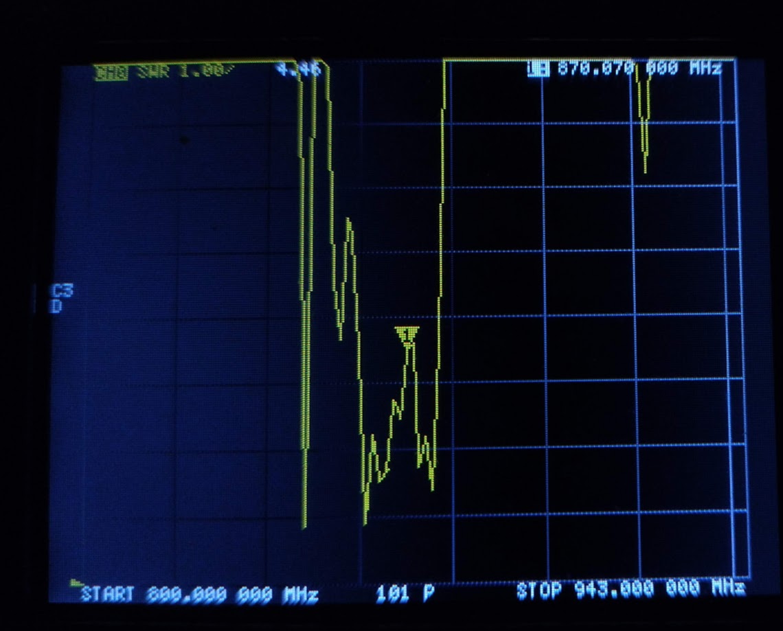 Analizator posiada zakres pracy do 3GHz. Został skalibrowany na zakres pomiarowy to 800 do 940MHz. Znacznik (trójką) dokładnie na 870MHz.